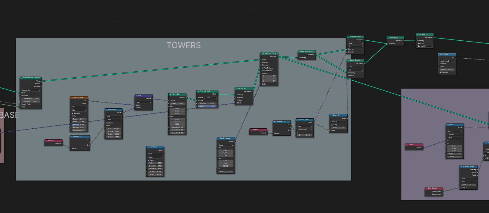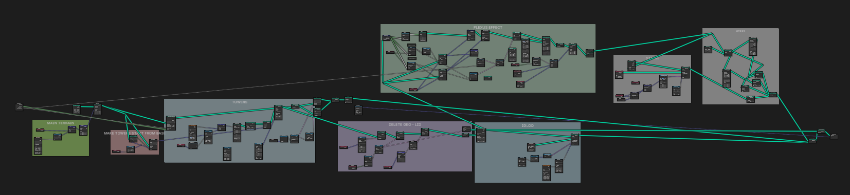 Project created procedurally in Blender with Geometry Nodes, while the Compositing was done in Nuke. The Towers, bridges and igloos are procedural. The water was done with the Ocean Modifier. It’s shaders involved image textures of acrylic paintings done at home + procedural shading. Scroll down to see the behind the scenes and node setup.